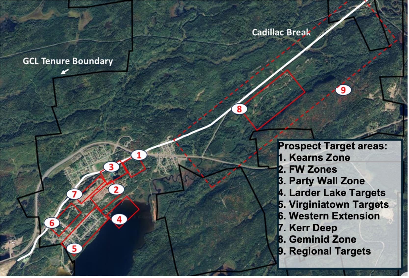 Figure 3 – Map of Gold Candle tenure outlined in black and drill target zones outlined in red with numeric legend along the Cadillac Larder Lake Break (CCLB).