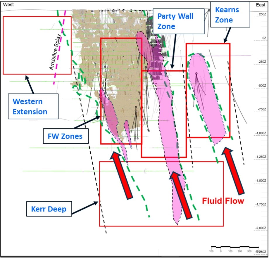 The Party Wall is the extension of the Kerr-Addison mineralized system east of the historical-mined areas, below the former Chesterville Mine.